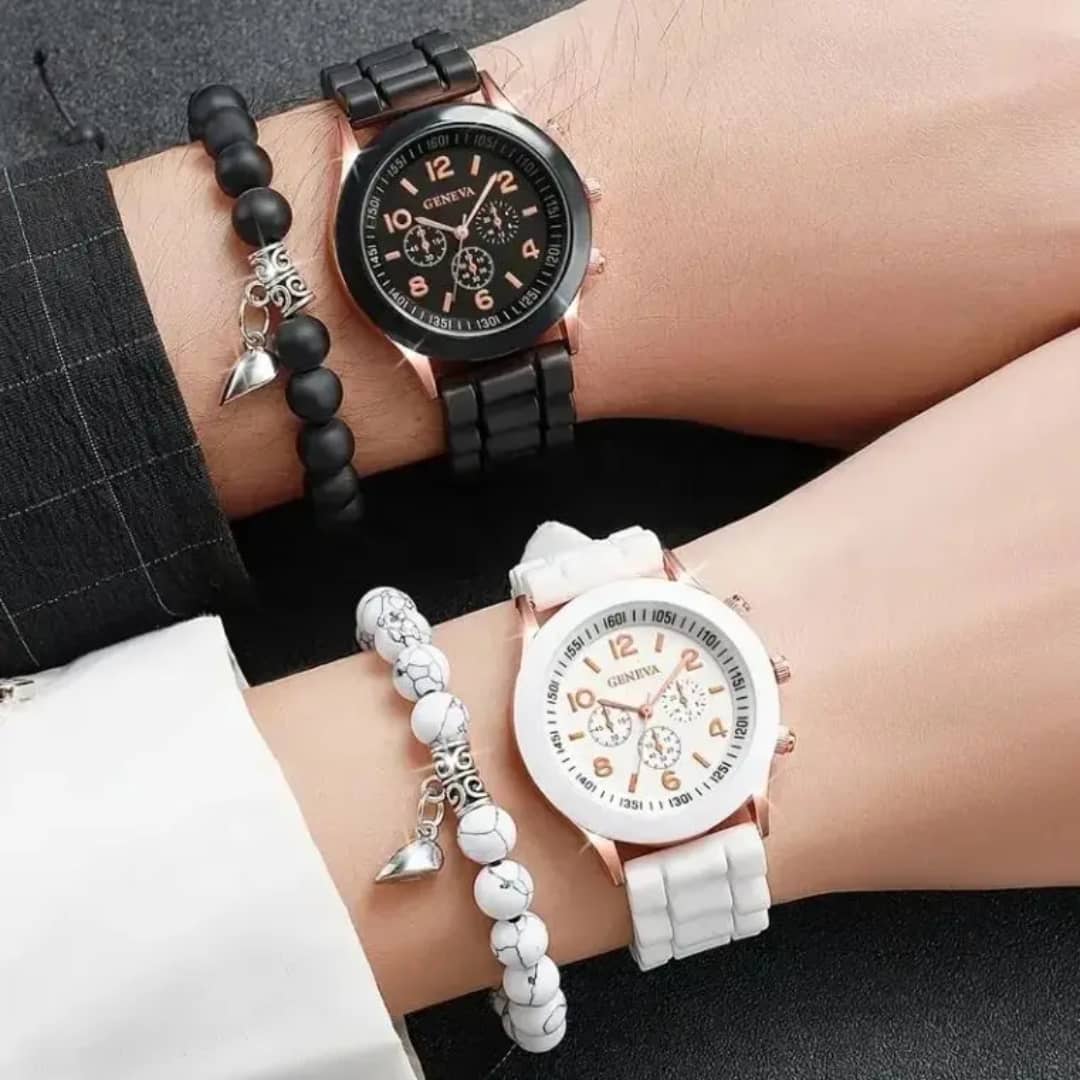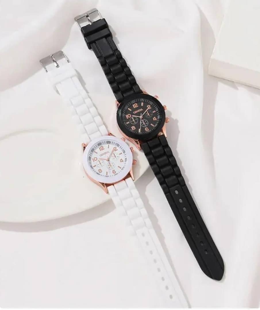"أناقة تكتمل معاً." الطقم المثالي للثنائيات أو كهدية فاخرة لمن تحب. ساعتان بتصميم عصري وأنيق، واحدة باللون الأبيض الناصع والأخرى بالأسود الملكي، تأتيان بحزام مطاطي (سيليكون) مريح جداً وعملي.